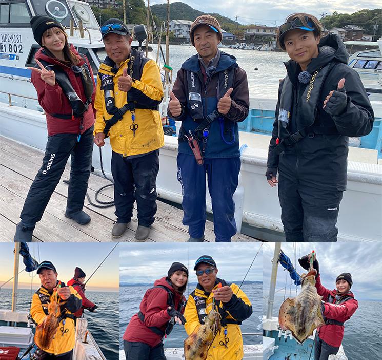 ~三重県 五ケ所沖~今回の舞台は、三重県五ヶ所沖。クレイジーオーシャンの太田さんをはじめ、あゆちぃ、仲さん、土井さんの4人が、晩秋のアオリイカをティップランで狙います。早朝、ポイントに到着したメンバーは、さっそくエギを投入。すると、一投目から太田さんにまさかのヒット!見事、良型のアオリイカをキャッチします。幸先の良いスタートに沸く中、続けてまたも太田さんにヒット。開始早々、2匹を手にします。その後もアタリは続き、今度は土井さんと仲さんにもヒット。これで4人中3人がアオリイカをキャッチし、残すはあゆちぃのみ。エギのカラーを何度も替えながら狙い続けるあゆちぃ。すると、テンションフォールで待望のヒット! 見事アオリイカをキャッチし、全員安打を達成します。その後もアオリイカは釣れて晩秋らしい盛り上がりを見せてフィニッシュ。これからさらにサイズアップが期待できる季節、魅力満点のティップランをどうぞお見逃しなく!