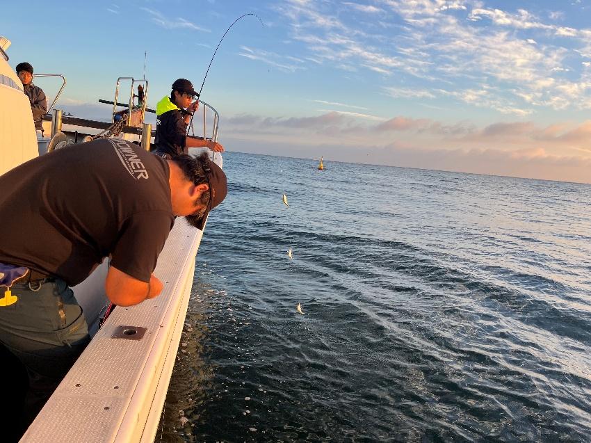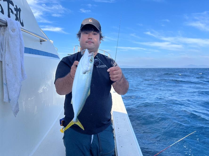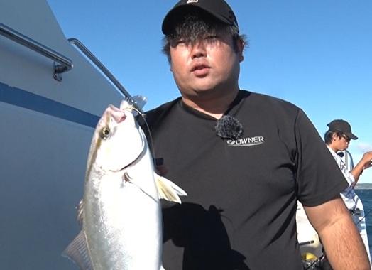 西馬さんも同じ仕掛けにアジを付けて、ポイントへ投入します。活性が高い朝マズメ。二人はヒラメと青物を狙ってアタリを待ちます。すると、渋谷さんの1投目にいきなりヒットしました。釣れたのはヒラメではなく、シオ(カンパチの子供)でした。早速やりました渋谷さん。