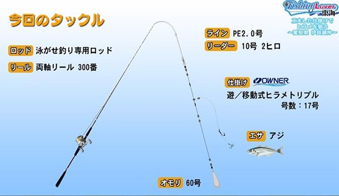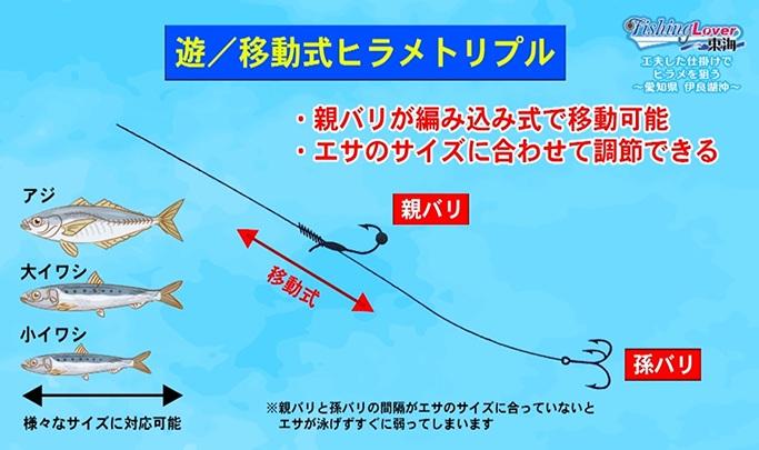 泳がせ釣りのタックルは、まず泳がせ専用竿に、リールは両軸リールの300番。仕掛けは、ベイトのサイズに合わせて親バリの位置が調整できる遊/移動式ヒラメトリプル、エサは、アジの活き餌を使用します。