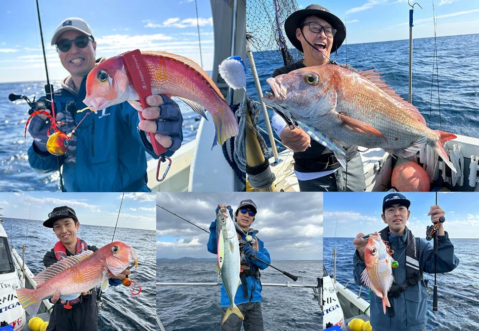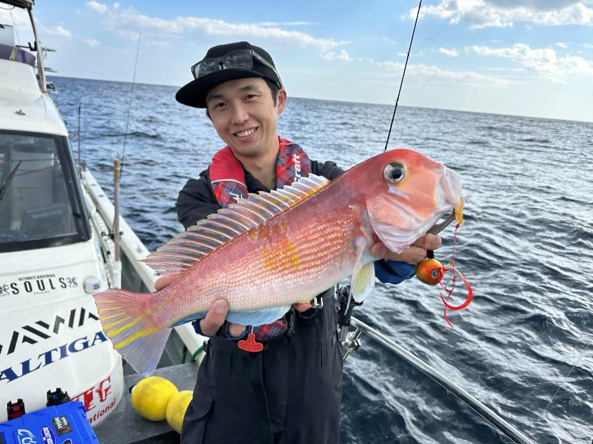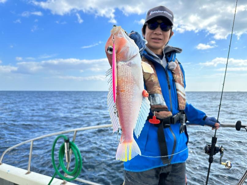 次に橋本さんがアマダイを釣り上げた後、ようやく椋本さんにこの日最初のヒットがきました。釣り上げたのは、グッドサイズのアマダイ。広瀬さんがタイラバで釣っているのを見て、ジグからタイラバに変更していました。替乃実TGハイブリッド130gを150mほど出したところで釣れました。椋本さん、やっと釣れました。と、ホっとした様子。