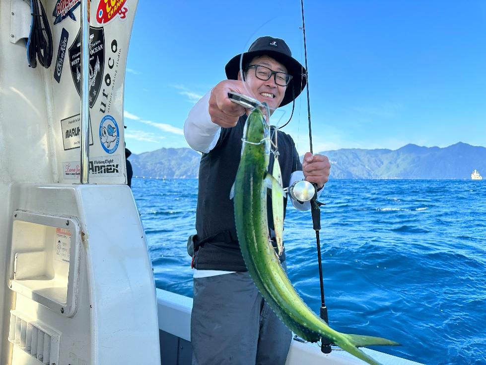 続いてまた柴田さんにヒット。表層を高速巻きで誘っていたところにアタリがありました。今度の魚は、なんとシイラ。これには柴田さんも予想外の展開で驚きです。
