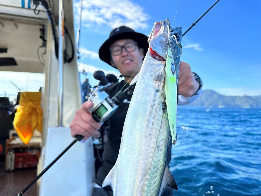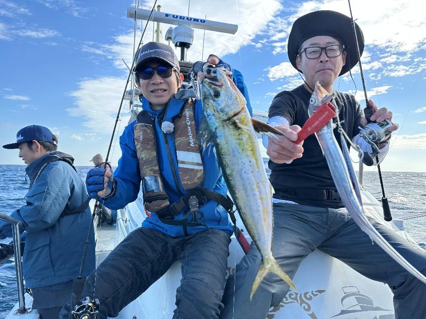 ここでポイントを変えて、さらに水深の深いエリアへと移動します。移動してほどなく、柴田さんにまたヒット。続いて、橋本さんにも本日最初のヒットがきました。ダブルヒットです。二人共、ジグパラバーチカル クウェルを使っています。柴田さんはタチウオ、橋本さんはシイラを釣り上げました。