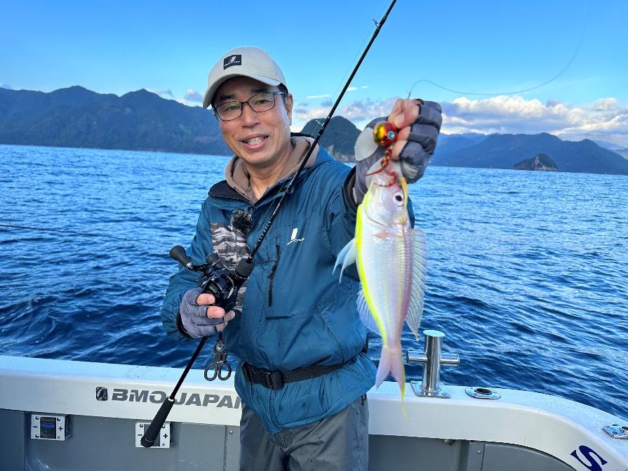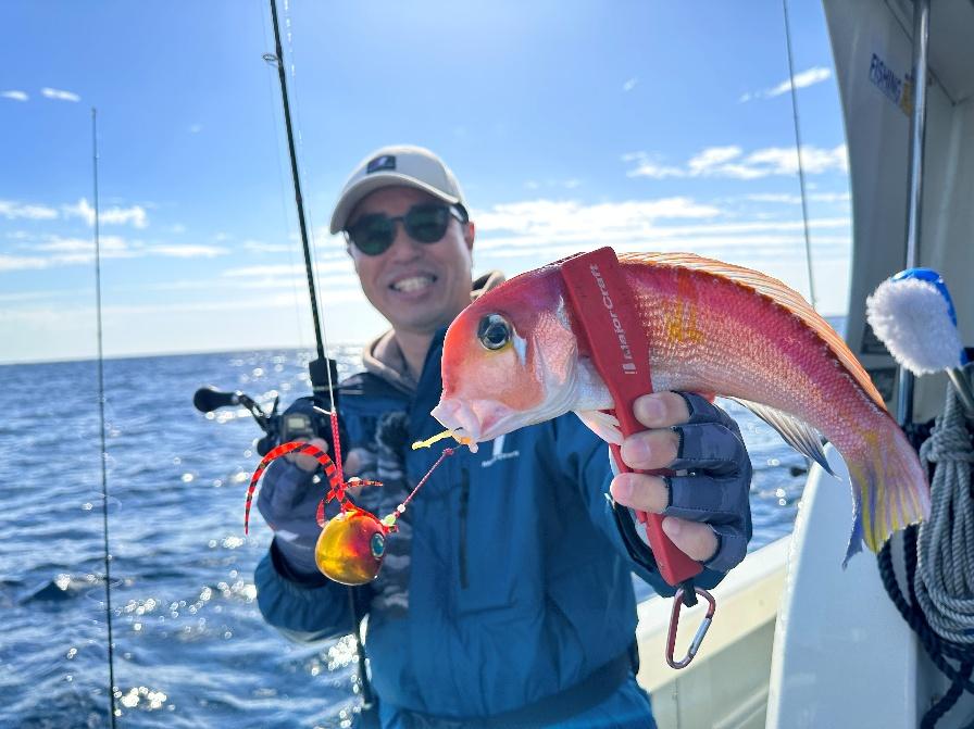 この日最初のヒットは、広瀬さん。手応えは、重いだけの感触なので根魚かな?と思いつつゆっくりと上げてきます。釣れたのは、イトヨリダイでした。ケムケムカーリーに反応したようです。
