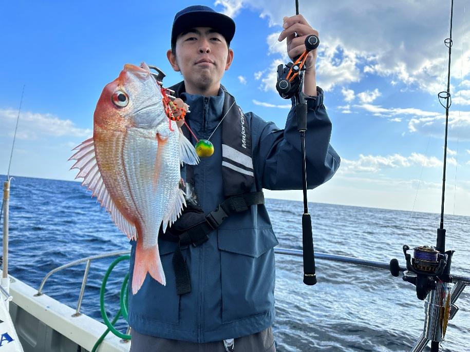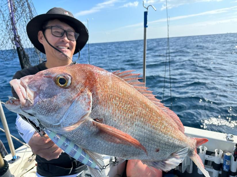 広瀬さんがこの日の五目を揃えました。しかし、本当に今日は多種多様な魚が釣れます。立て続けに、今度は柴田さんにヒット。船内が賑やかになってきました。柴田さんは結構な重量感を感じている模様。これは期待ができるサイズかも!? 魚とのやり取りを慎重におこない、上がってきたのは、やりました!本命のマダイです。しかもいいサイズ。これには柴田さんも嬉しそう。クウェルのスーパーグローゼブラグロー150gで釣りました。