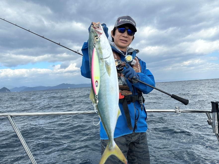 この日の釣りもいよいよ終盤へ。次のポイントに移動した直後、橋本さんにヒット。フォールで喰ってきた様子。クウェルのアピール力が効きました。釣れたのは青物のハマチでした。これで今日の7魚種目。