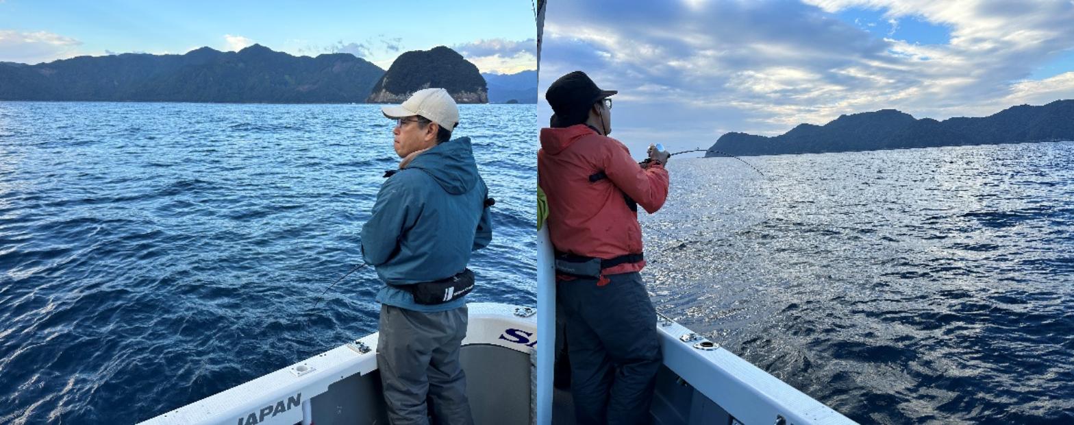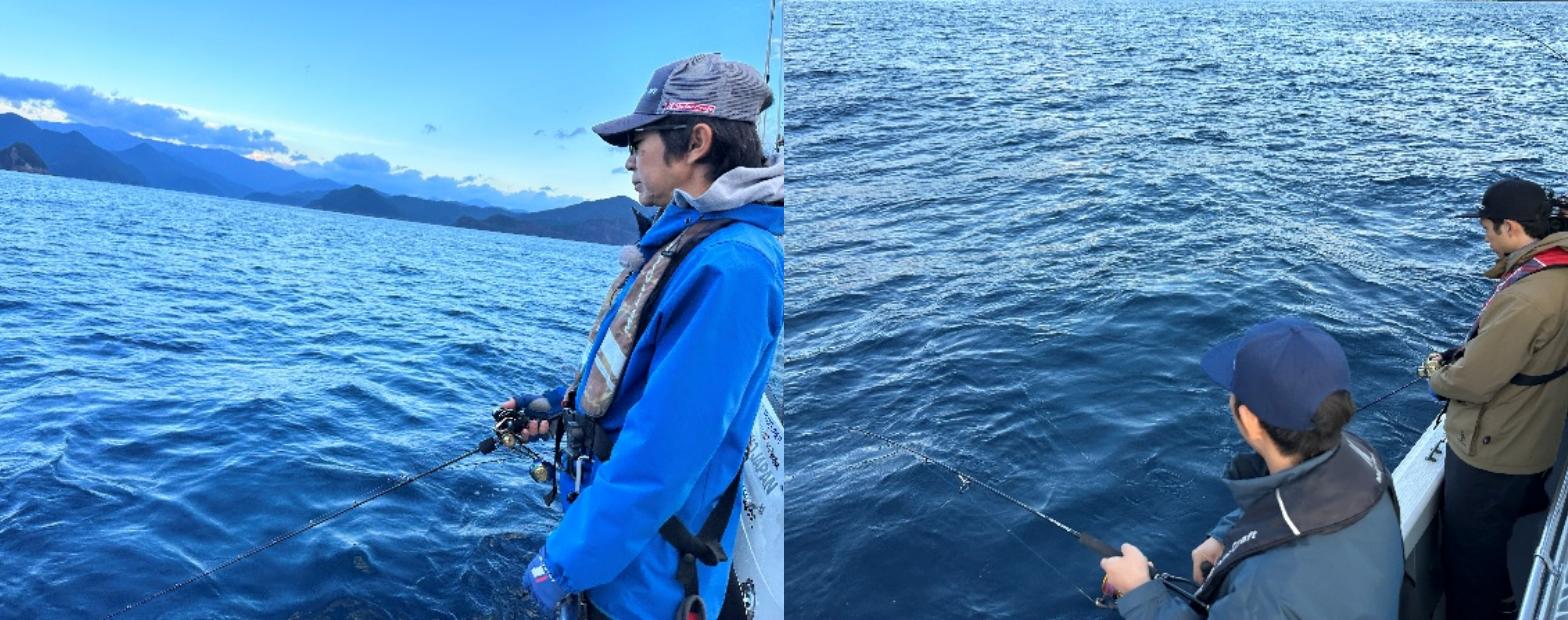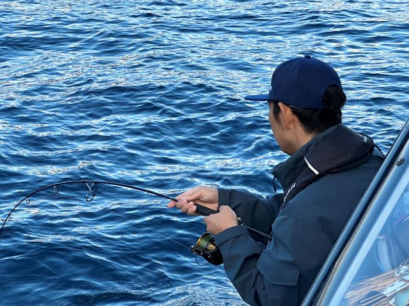 午前6時40分、一行は尾鷲湾、天満浦埠頭を出発し朝マズメを狙います。今回お世話になる釣り船は、ゴールデンイーグル。船を走らせること30分で最初のポイントに到着しました。水深は70~75m。船長の合図でルアーを投入します。ここがまさに期待が高まる瞬間です。