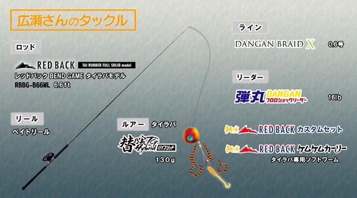 最初に広瀬さんが使用するタックルはこちら。6.6フィートのレッドバック ベンドゲームタイラバモデルロッドにタングステンコアを採用した替乃実TGハイブリッド130g。フックとネクタイがセットになった鯛乃実カスタムセット。そしてソフトワーム「ケムケムカーリー」を組み合わせて使用します。