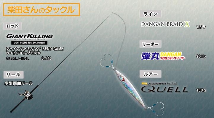 柴田さんのタックルは、6.4フィートのジャイアントキリング ベンドゲームライトジギングモデルロッドに、メタルジグのジグパラ バーチカル クウェルを使用。幅広い重量ラインナップから、150gを選択しました。