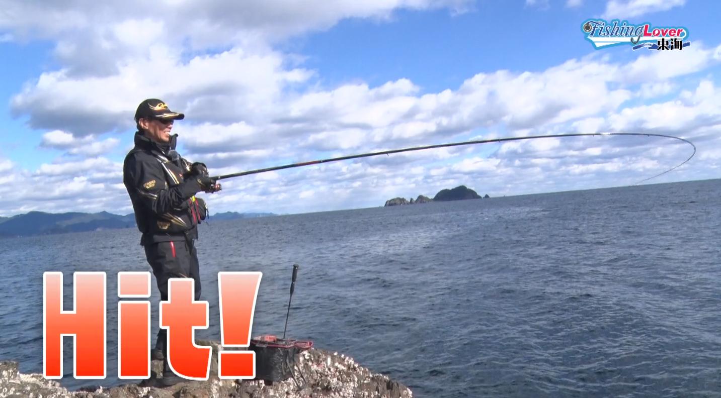 しばらく仕掛けを浮かせ気味にして待っていると、突然ヒット。がま磯 グレスペシャルFが大きく弧を描き、前岡さんもサイズに期待できる手応えを感じます。