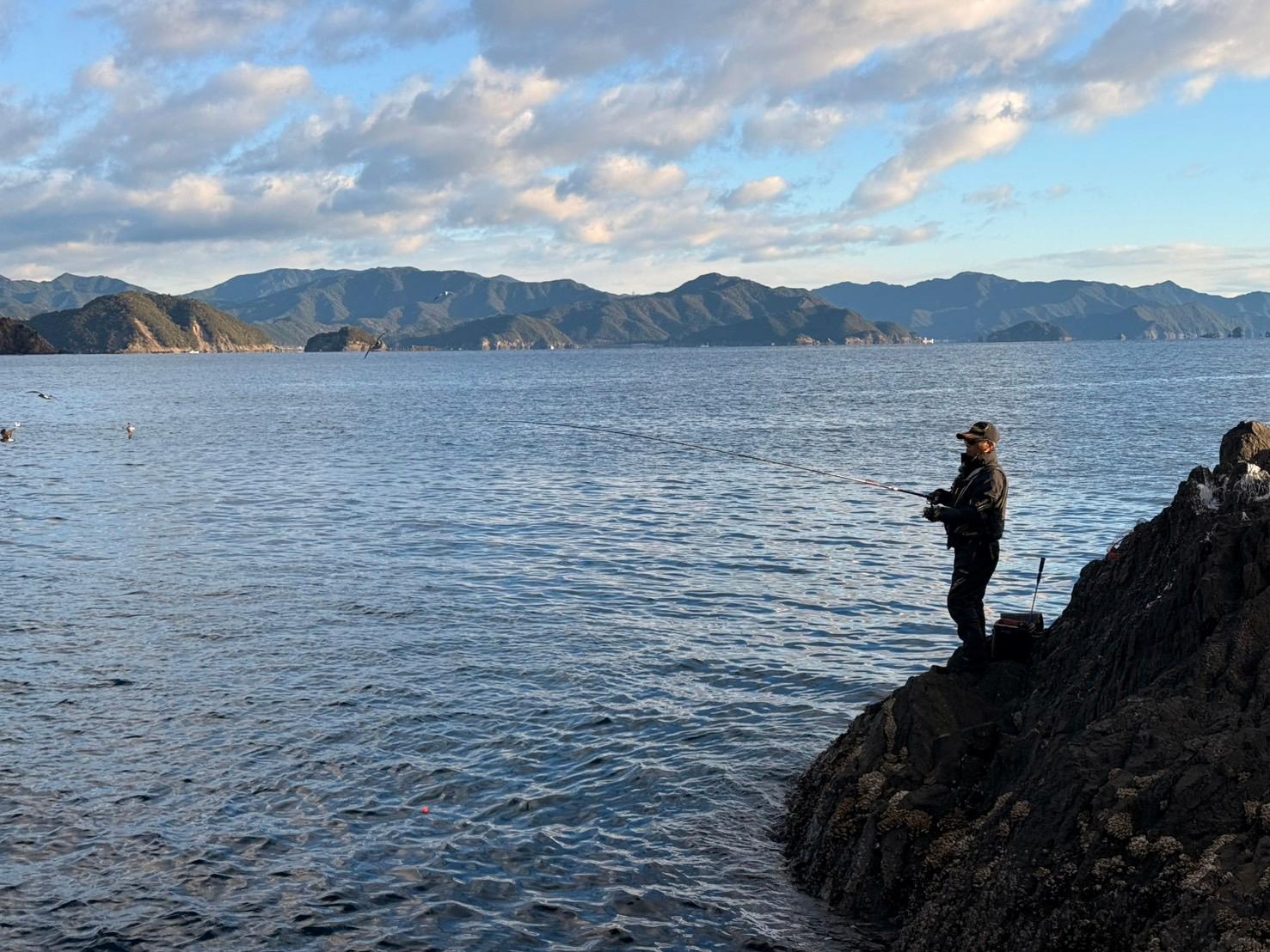 前岡さんは、今度は遠投で沖を攻めることにしました。少し離れた沖に、海面近くに群れている「湧きグレ」を発見したようです。仕掛けをキャストしても、わずかに距離は届きませんでしたが、撒き餌を打ちながら反応を待ちます。