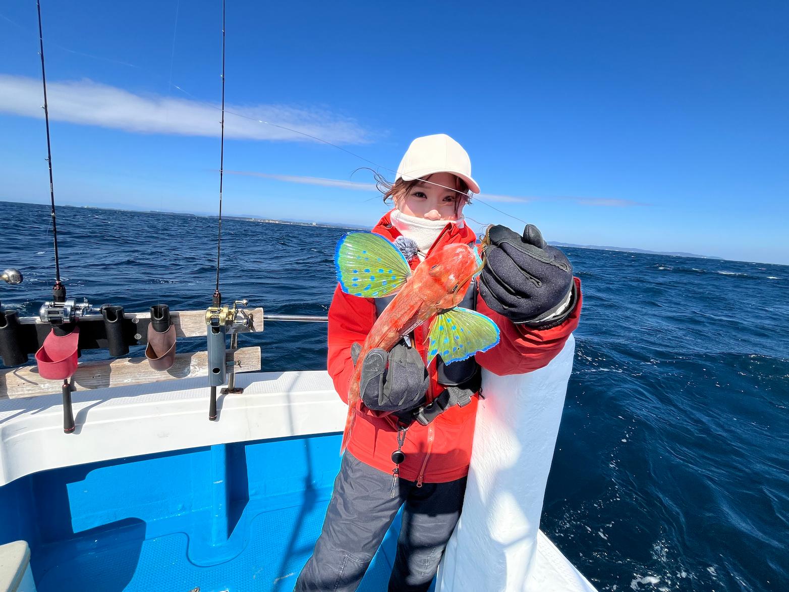 その直後、仲さんの竿にもわずかな反応が。手応えはほとんどありませんが、回収してみるとホウボウがついていた、といった形で1匹をキャッチ。まずは1匹釣れたことで、得意のダジャレも飛び出し、場の空気も和みます。