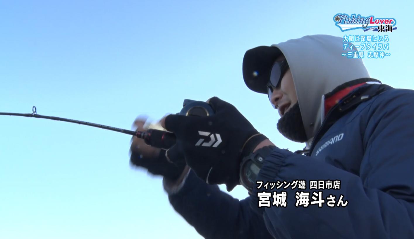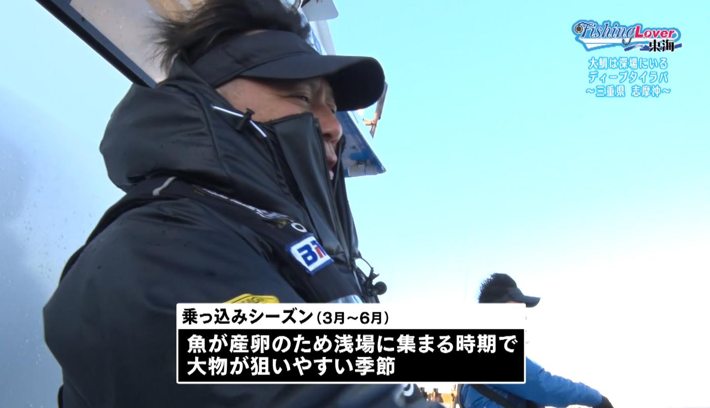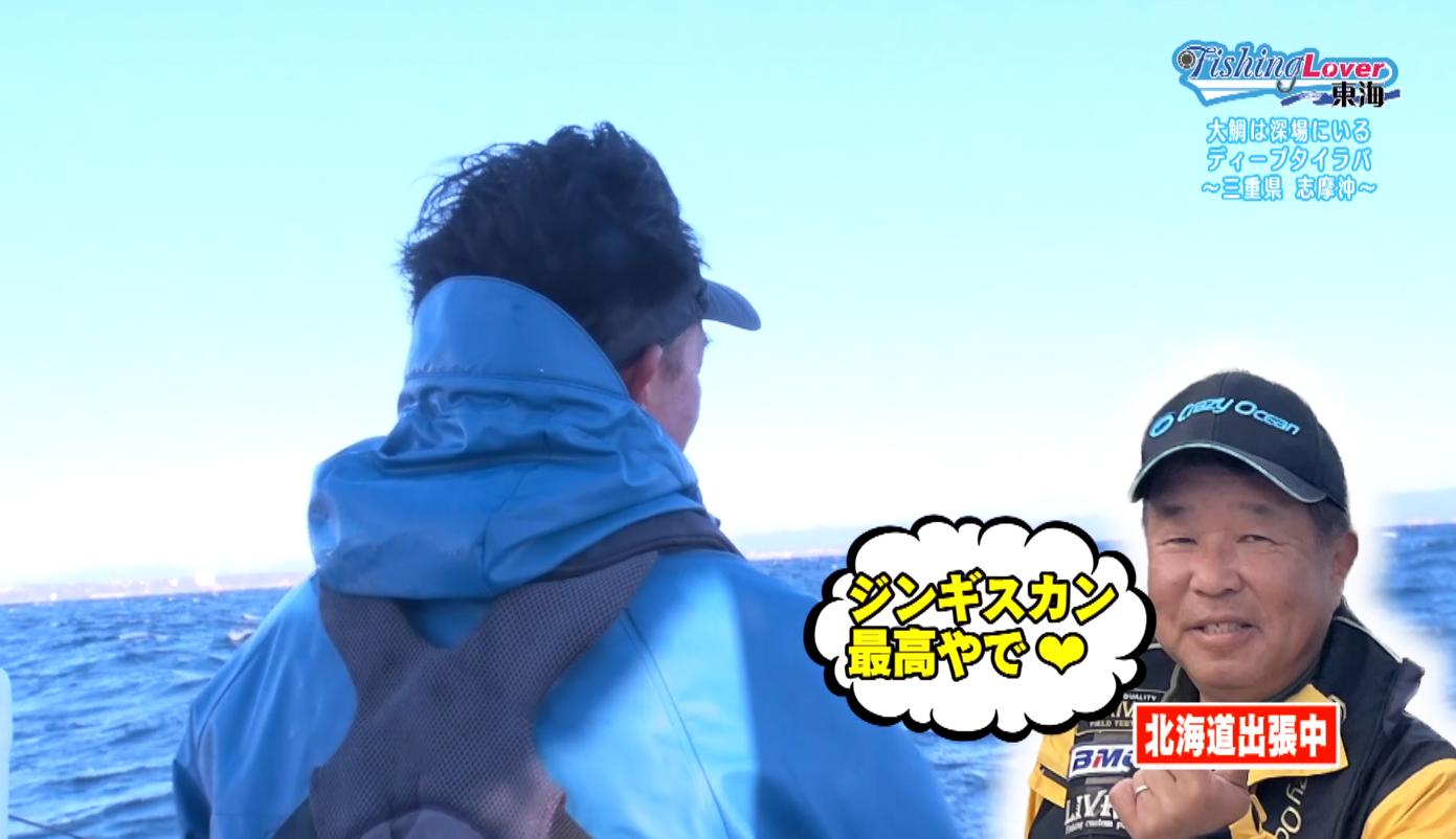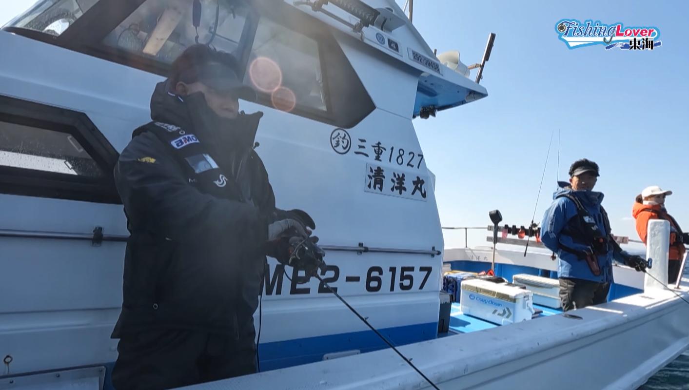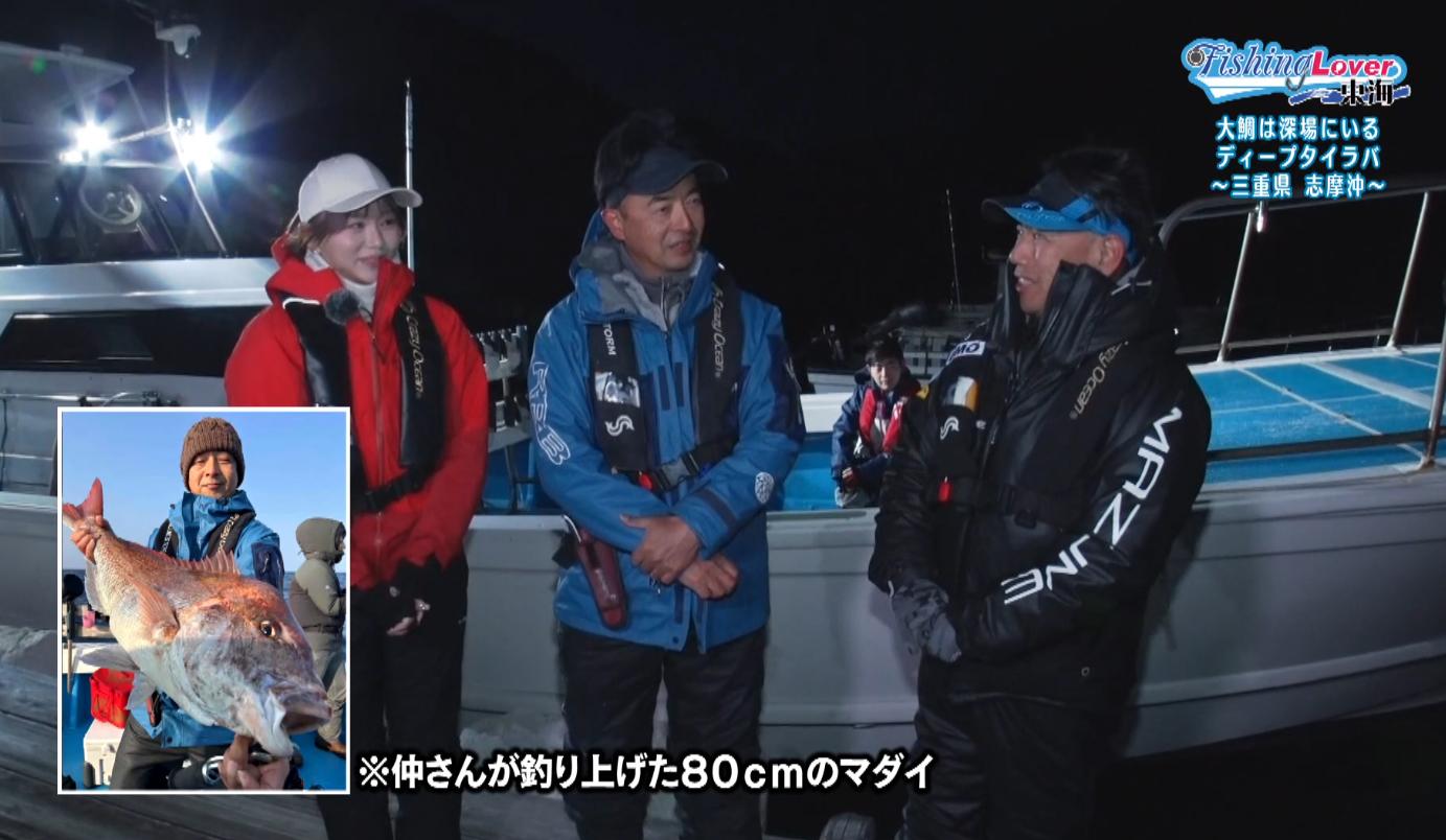 今回の収録前、お世話になる船宿「清洋丸」さんで、仲さんはなんと80センチオーバーのマダイをキャッチしたそうです。番組でも期待が高まりますが、この日は冬の寒さが戻り、極寒のうえ海も荒れ模様。厳しいコンディションとなりそうです。そんな中、3人に加え、この日たまたま乗り合わせていたフィッシング遊 四日市店の宮城さんと、松阪店の折田さんも、急遽サポートメンバーとして参加。一行は、ポイントを目指し沖へと向かいます。