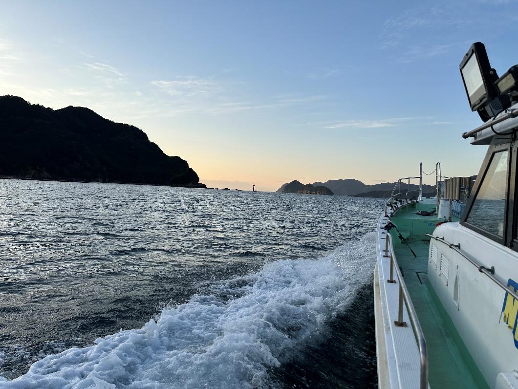 朝6時半、熊野灘に抱かれた漁師町の港、引本港を出発します。お世話になる釣り船は、この海域を知り尽くすエヌテックマリンのガイド船。船を走らせること約15分で最初のポイントに到着。
