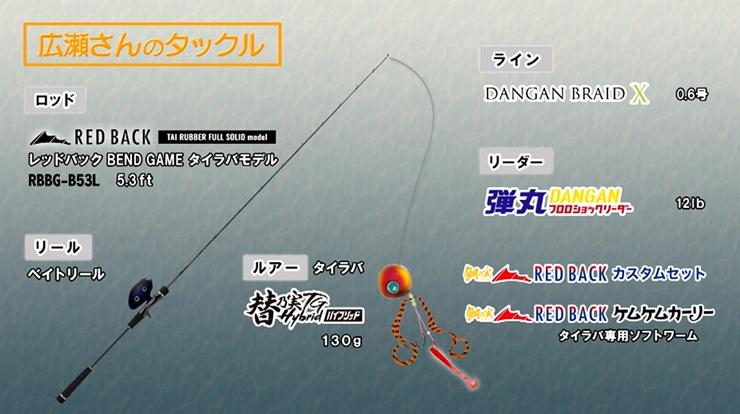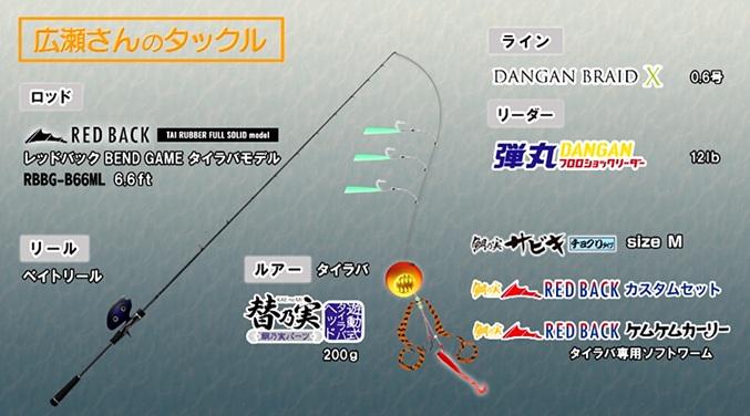 今回、広瀬さんが使用するタックルはこちら。ロッドはレッドバックBENDGAMEタイラバモデル5.3フィートのショートタイプ。そしてタングステンコアを採用した130gの替乃実TGハイブリッドに、ネクタイとフックがセットされた、レッドバックカスタムセットを取り付けます。さらに、タイラバ専用ワーム、ケムケムカーリーを組み合わせて準備完了。