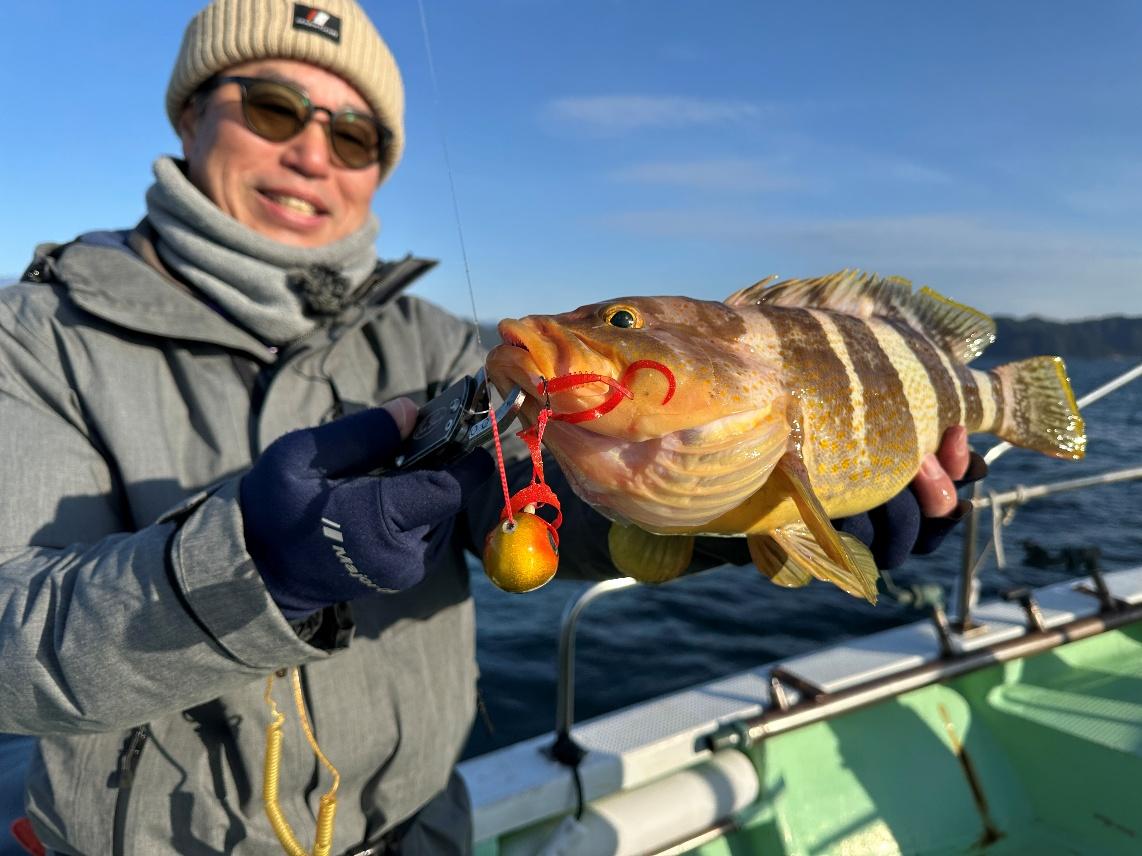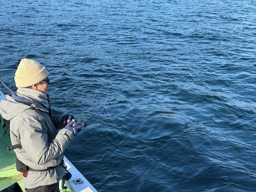 そろそろ船は最後のポイントへと走ります。今度は水深74mのポイントです。広瀬さん、なんと一投目で早くもアタリを捉えました。フォールで掛かったようです。この日の最後を締めくくるこの一本、果たして、何が掛かったのでしょうか? やってきたのは、アオハタでした。
