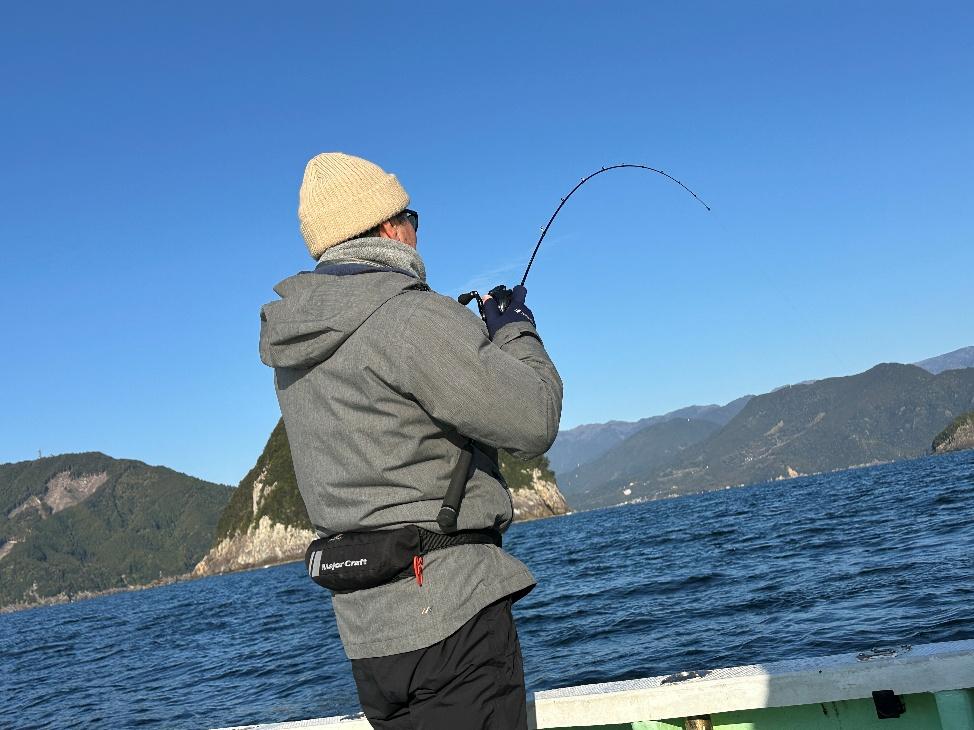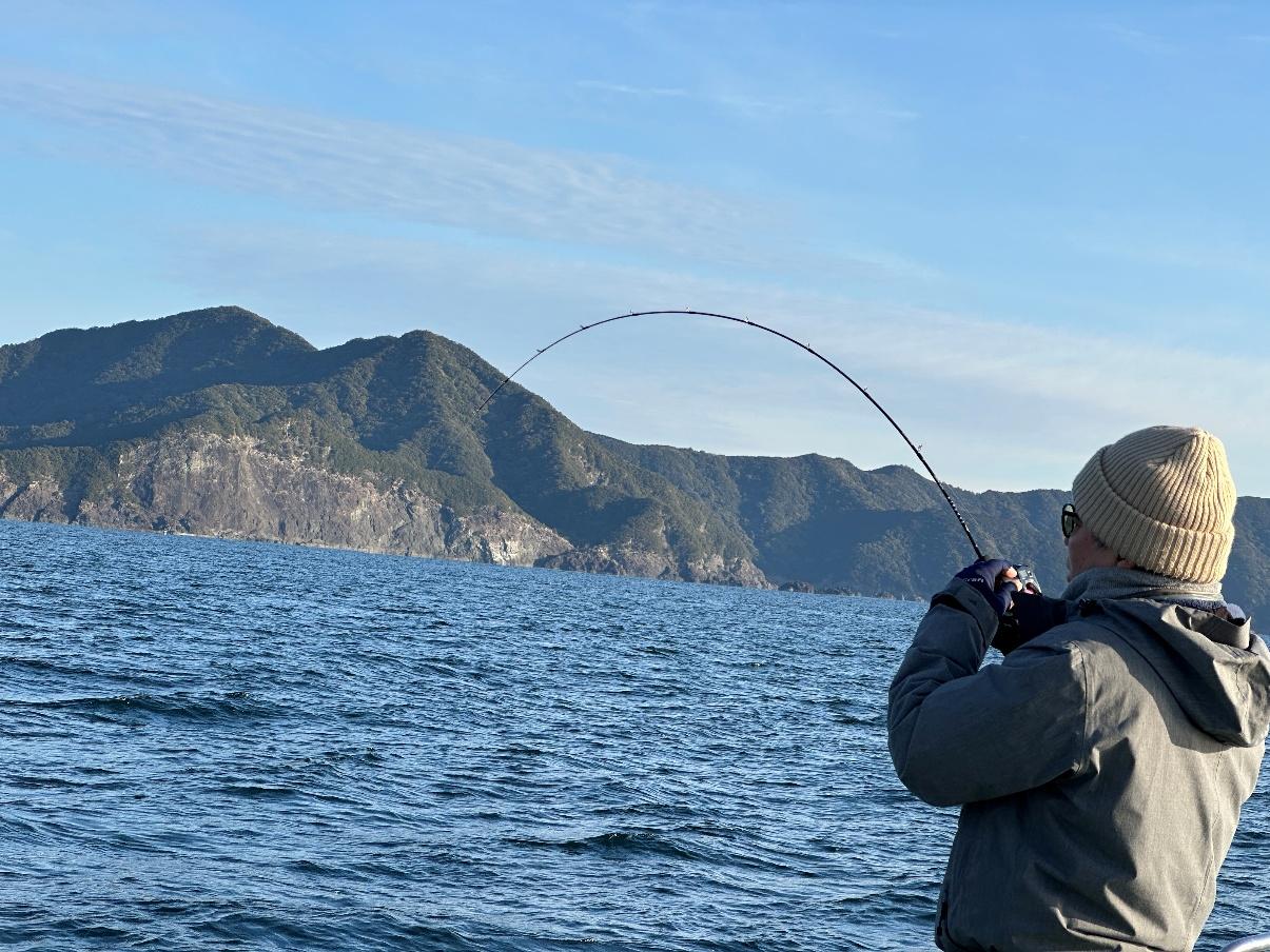 そこで、反応を求めてさらに船を走らせます。次は水深75mと段々深くなってきました。するとここではすぐにヒット。結構引きのある魚で、重量感のあるファイトが楽しめます。ペースを変えずに、ゆっくりと巻き続けます。何が掛かっているのかわかりません。広瀬さんフルソリッドのロッドを曲げて、テンションを維持しながら慎重にやり取りを続けます。